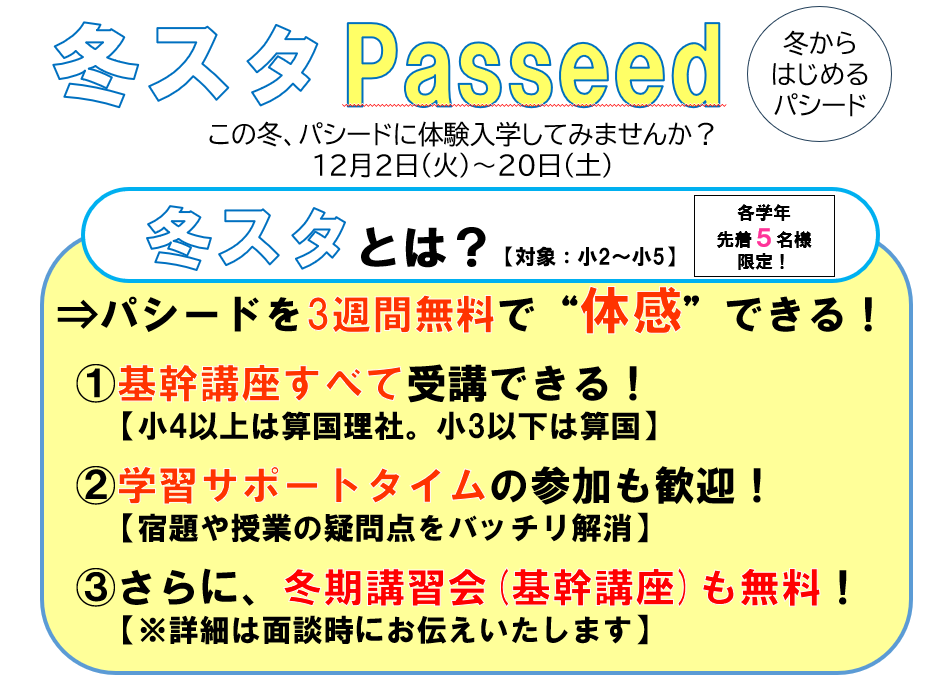 - この冬、小学5年生以下のお子さまを対象とした冬休み前の3週間無料体験を実施します。
